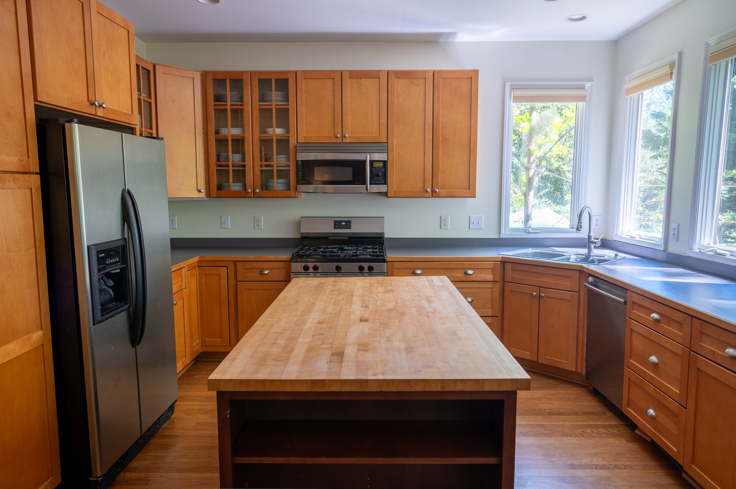 Set on a rare 1-acre lot in a quiet neighborhood just 6 miles north of downtown Durham, the home feels tucked away while still offering the convenience of city water and sewer. The large lot and layout would easily accommodate a private guest cottage. Inside, the home features a thoughtful custom layout with warm craftsman details throughout. Highlights include custom features like high-quality cabinetry, a butcher block island, built-in bookcases, a wood-burning fireplace with tile surround and oak mantel, craftsman-style light fixtures.